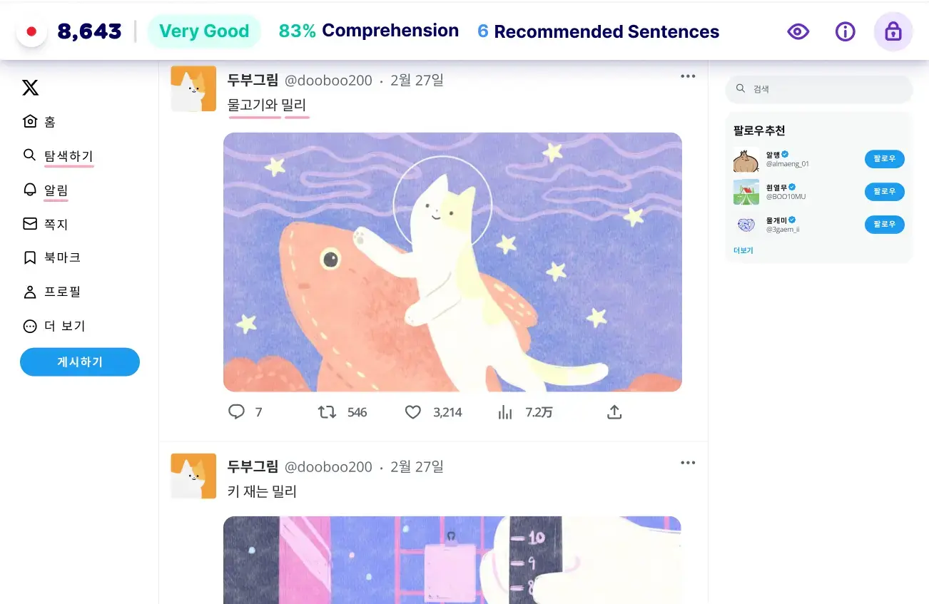 The best way to study Korean is by consuming content you enjoy and understand. Migaku tracks the words you’ve learned to tell you if a particular piece of content is suitable for your level.