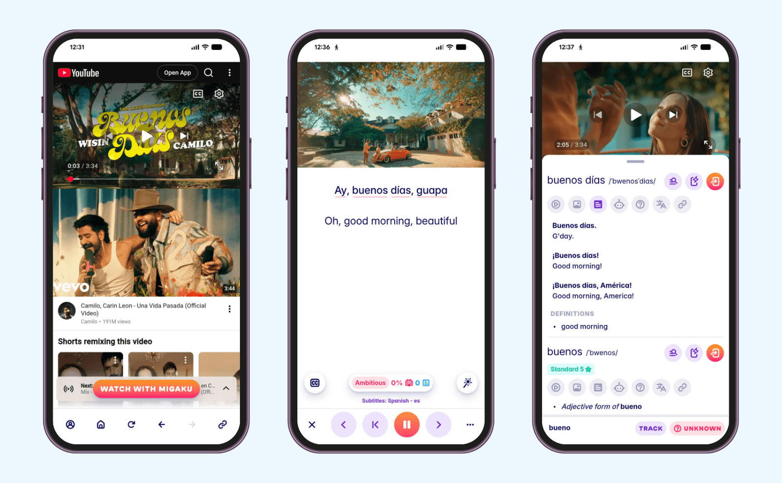 With Migaku, subtitles appear in both Spanish and English. You can click on any word you don’t know for a quick explanation without pausing the video.