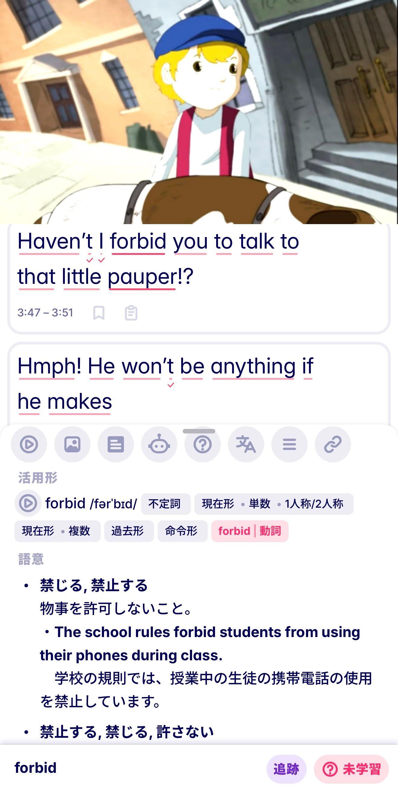 動画学習機能を使えば、NetflixやYouTubeなどのコンテンツを見ながら、字幕内のわからない単語の意味をワンクリックで確認でき、そのままフラッシュカードに保存してサクッと復習できます。