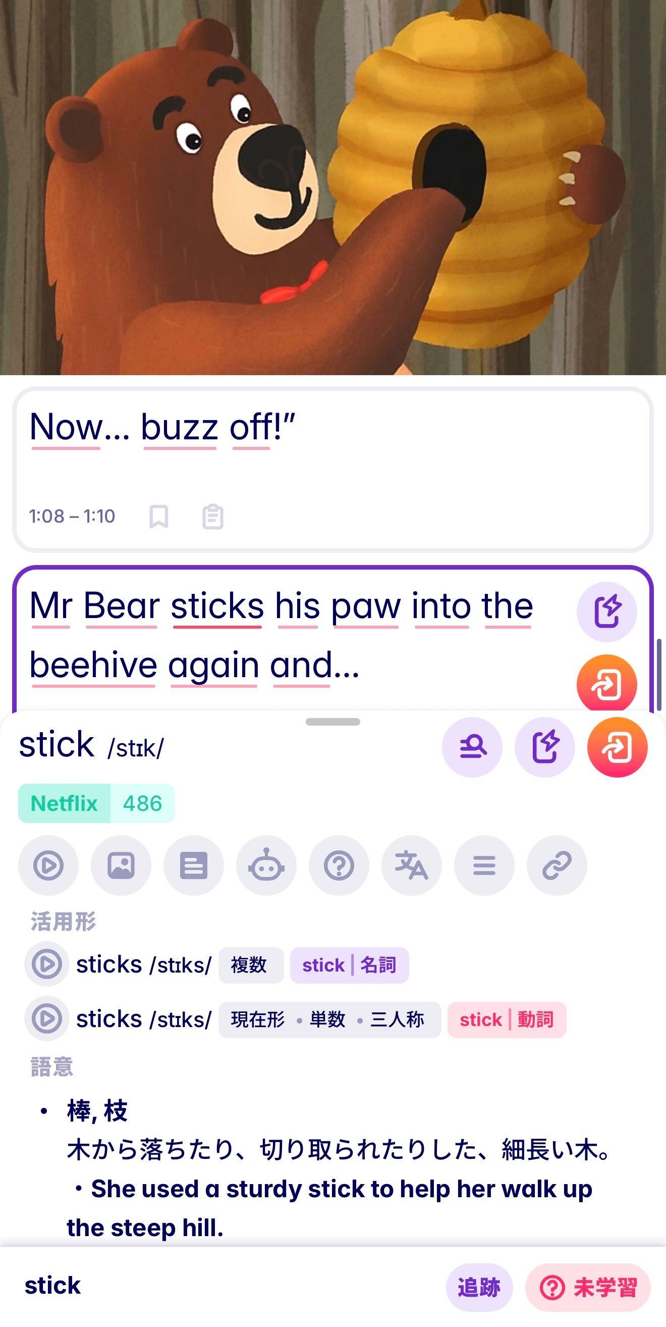 動画学習機能を使えば、NetflixやYouTubeなどのコンテンツを見ながら、字幕内のわからない単語の意味をワンクリックで確認でき、そのままフラッシュカードに保存してサクッと復習できます。