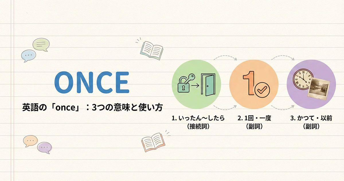 この記事では、英語の once が「一度」「一回」という意味だけでなく、「いったん〜したら」を表す接続詞として、条件と時のニュアンスを同時に伝えられる重要な単語だという点を見てきました。