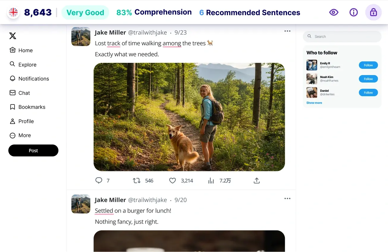 Whenever you open a new piece of English content, we’ll compare the words it contains to the words you know, letting you improve your English skills without being overwhelmed.