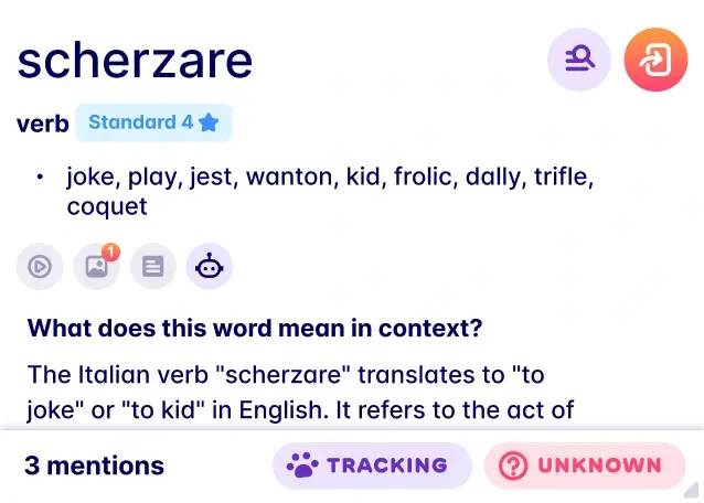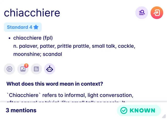 This streamlined sentence mining process makes Italian immersion very easy: the entire process of looking up a word and turning it into a flashcard takes less than a second. You're able to build your vocabulary from native media effortlessly.