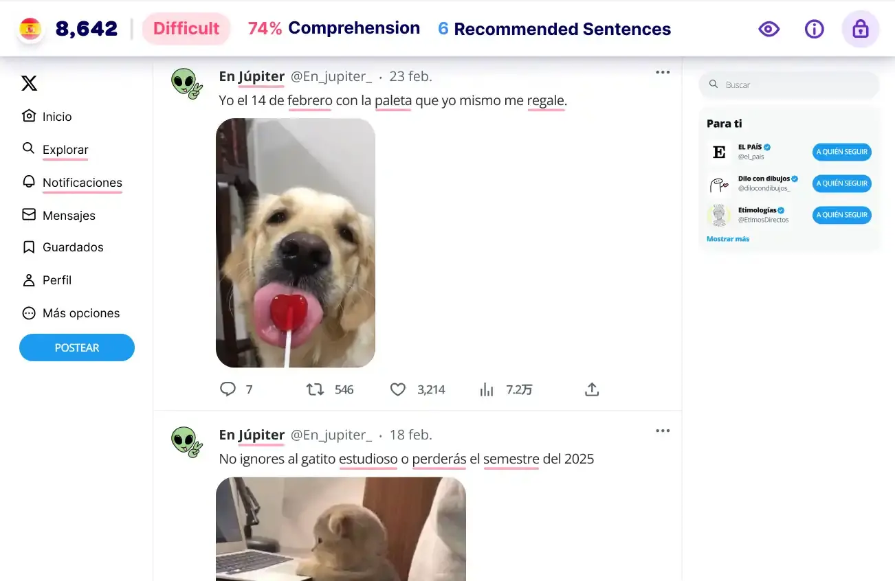 This information is used to calculate a personalized comprehension score for every piece of Spanish content you interact with, assigning them an approximate difficulty level. This visual progress tracking provides tangible evidence of your Spanish learning journey and ensures you learn with media that is suitable for your level.