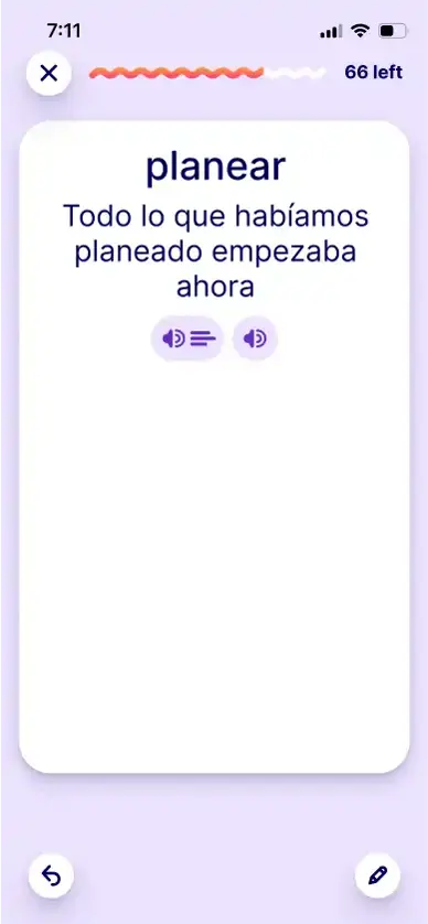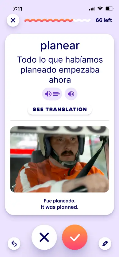 Create flashcards as you explore telenovelas, movies, and more: just click on new words and press the “make card” button. We’ll make a flashcard with your selected word, a context sentence, a screenshot, audio, definitions, and AI-powered insights.